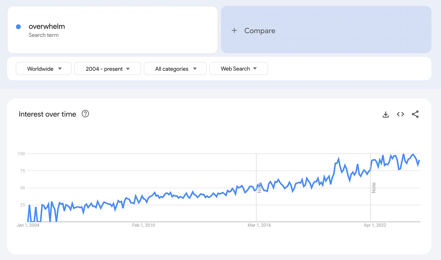 Clearly, overwhelm as a feeling is a topic that has ignited interest in the past few years. While there can be several factors, I can’t help but blame social media as the biggest one. The amount of information that we engage with on a daily basis has increased multifold. Social media, driven by mindless reels, the chasing algorithm, and the pressure to stay active and relevant, steals the opportunity for the mind to just be.