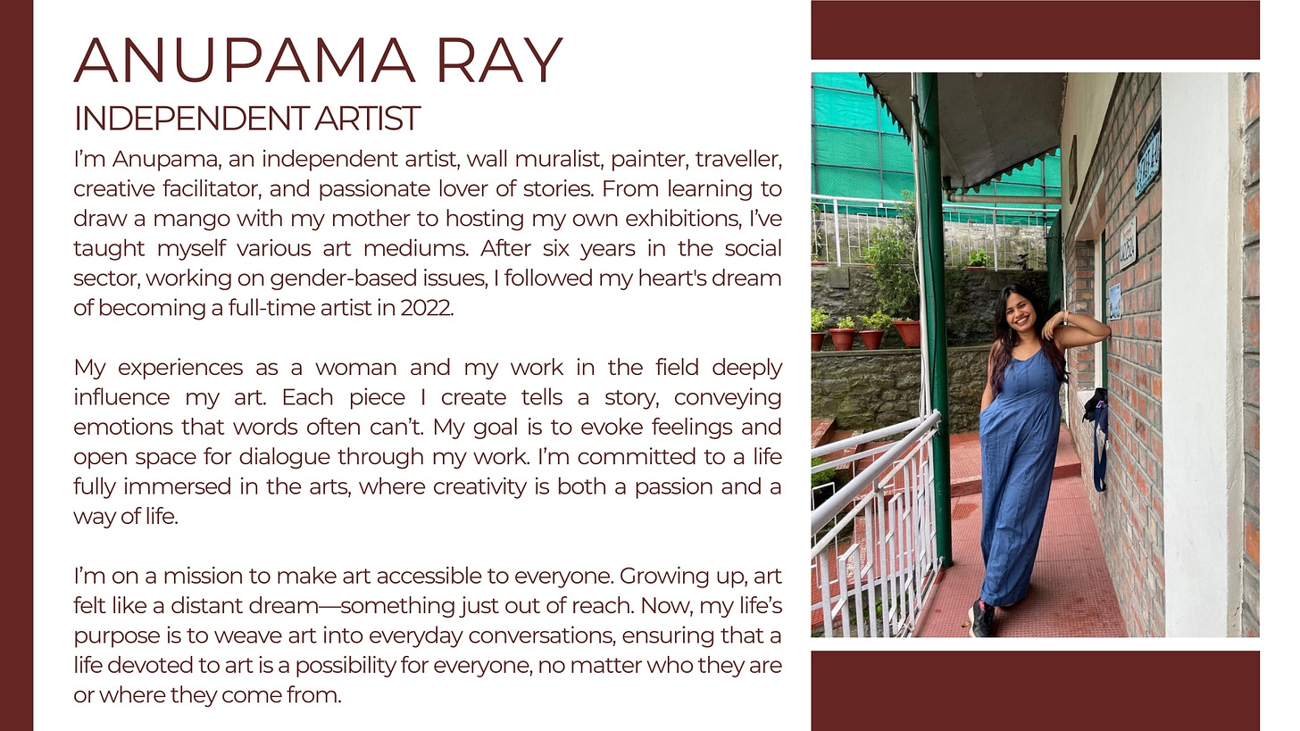 I’m honoured to present Anupama, an independent artist, wall muralist, painter, traveller, creative facilitator and a dear friend.